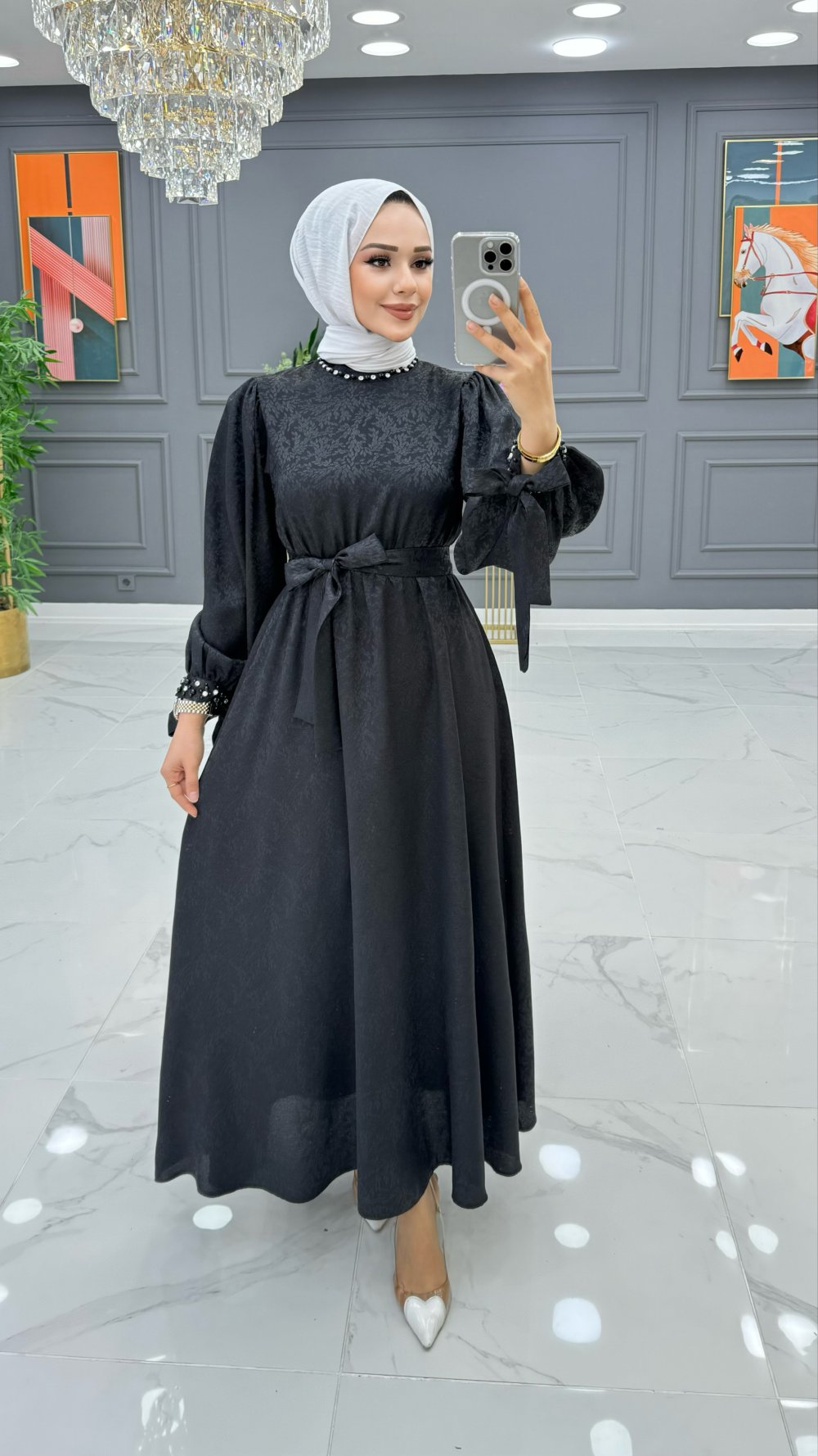 ELBİSE MANŞET  VE YAKA TAŞ BONCUK DETAYLIDIR.