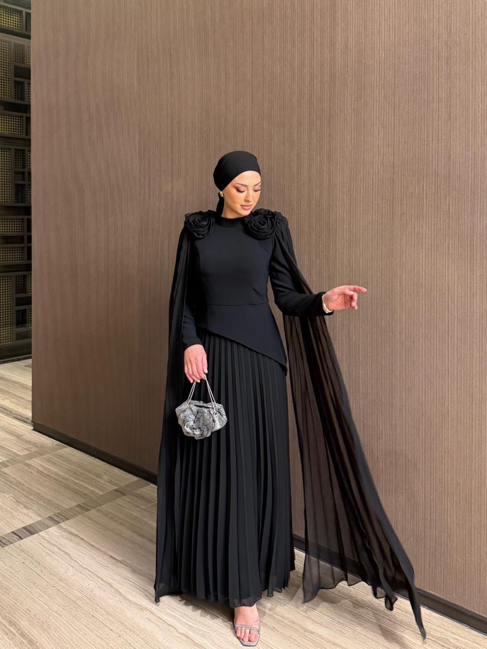 Ürün 1. Sınıf Üst Krep Alt Kısım ve Pelerin Şifon Kumaştır.