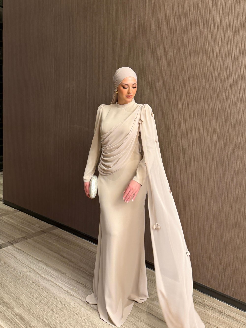 *Abiyenin pelerini çiçek detaylı, taşları çakım, arkası fermuarlı önü drape detaylıdır.Göğüs desteği bulunur.