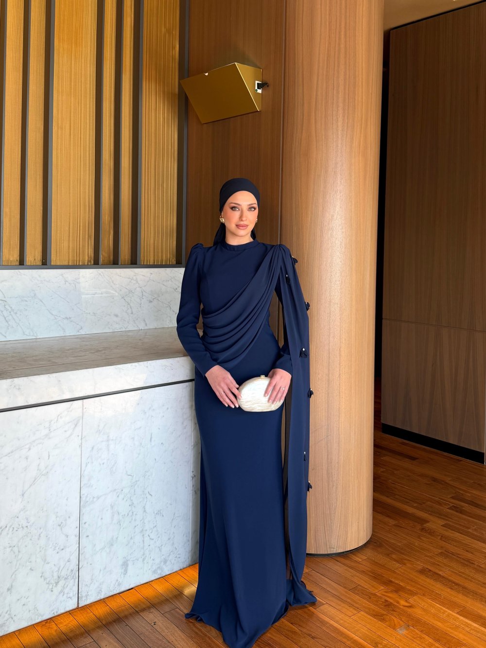 *Abiyenin pelerini çiçek detaylı, taşları çakım, arkası fermuarlı önü drape detaylıdır.Göğüs desteği bulunur.