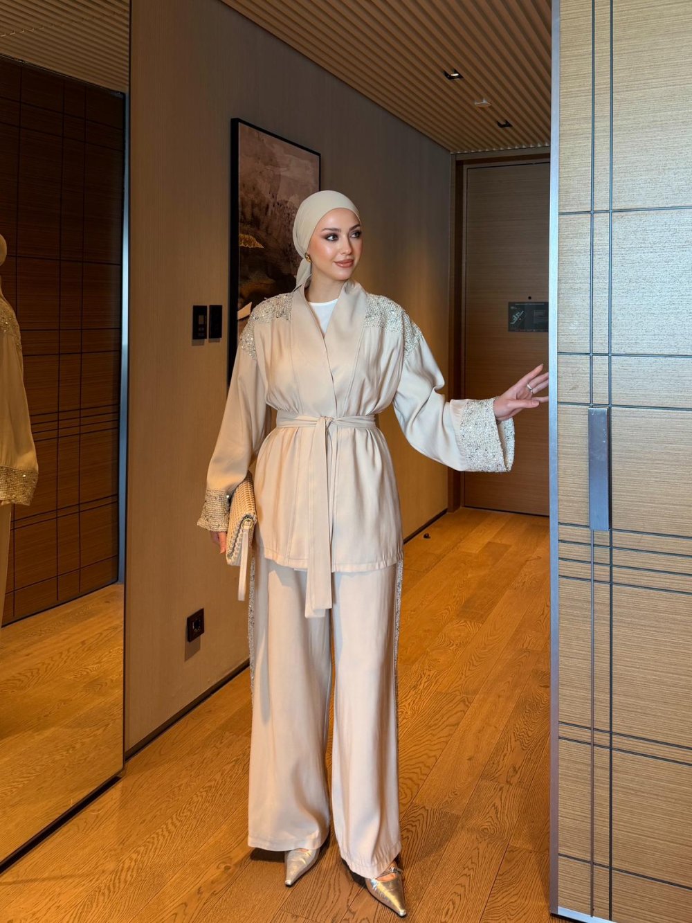 Pantolon beli lastikli, ve yanlardan şerit detayı vardır.