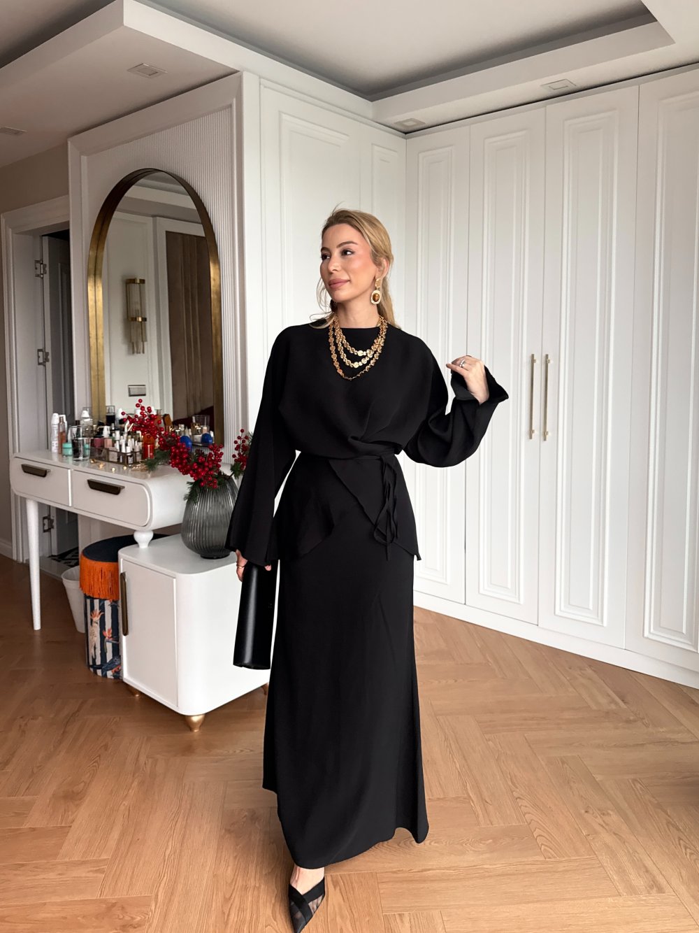 Takım Tunik  Etek Ucu Aimetrik Bağlama Detaylıdır.